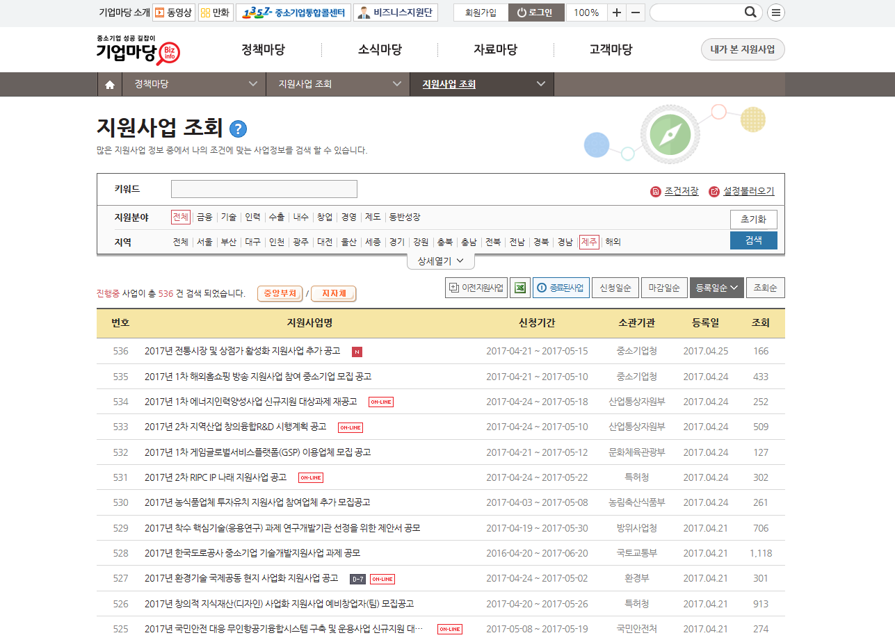 중소기업청에서 위와 같이 전국 지원사업 검색 서비스를 지원하는 기업마당이라는 사이트를 운영하고 있으니 참고하시길 바랍니다.