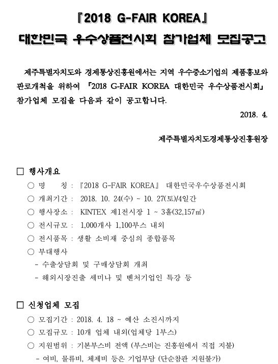 - 제목 2018 G-FAIR KOREA 대한민국 우수상품전시회 참가업체 모집공고 - 제주특별자치도 경제통상진흥원