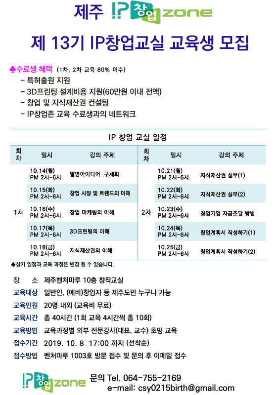 - 제목 제13기 IP 창업교실 교육생 모집 - 제주IP창업존